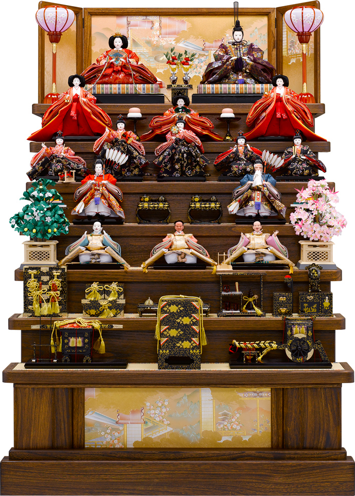 内裏雛は西陣織の金襴を大振りの衣装に仕立て、豪華な衣装の十五人飾りにしました。飾り台は本桐に古典塗で新流備畳です。屏風は本桐枠に豪華な金彩の屏風です。